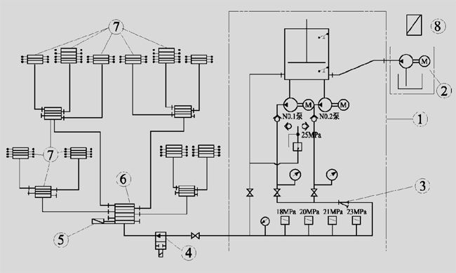 通過上述內容設計的單線式集中潤滑系統,在電控箱的有效控制下,能實現定時、定量、安全可靠地向潤滑點供送清潔的油脂。萬一系統出現故障,導致高壓潤滑泵的流速不正常,在設定時間內輸入系統的油脂量未達到設定值,即計時器計入的數值與計數器計入的數值之比超過設定的范圍時,電控柜自動報警,系統停止工作。一般系統正常工作時,泵站的額定壓力為 21MPa,如果系統出現故障,工作壓力超過 21MPa,高壓潤滑泵自動卸荷,而此時系統中的各種元件及管路均能承受21MPa的壓力,所以系統安全可靠。
