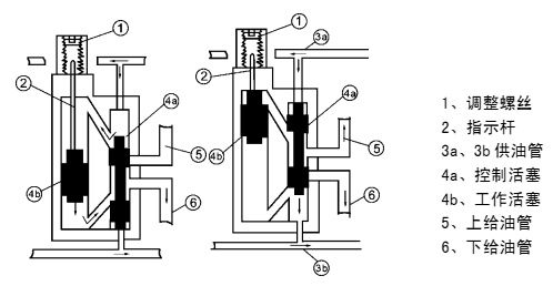 如上圖所示,由泵輸送來的潤滑脂,經(jīng)供油管3a進(jìn)入分配器控制活塞的上端,控制活塞首先向下移動(這時控制活塞下端擠壓的潤滑脂則進(jìn)入卸荷的供油管3b),使工作活塞的上腔與控制活塞的上腔連通,然后工作活塞向下移動,這時受工作活塞擠壓的潤滑脂經(jīng)過控制活塞的環(huán)型槽被壓送到出油口6至潤滑點,完成第一周期的給油動作。切換至供油管3b供油開始第二周期的給油動作,分配器活塞按相同的順序反向進(jìn)行前述動作,出油口5排送潤滑脂。