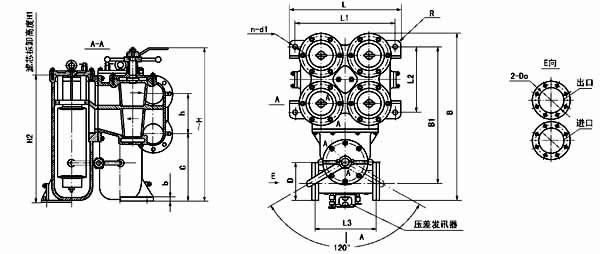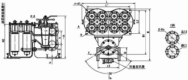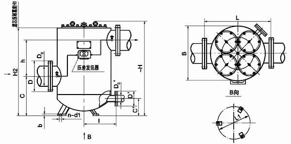 法蘭標準:GB573-65(可根據需要確定):DN100、150-3 組濾芯組件 DN200-4 組濾芯組件;壓差發訊器為選配件。