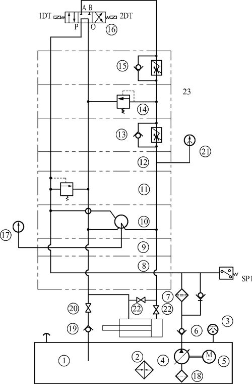 SZ-C 稀油潤滑裝置是控制回轉窯液壓擋輪動作的動力裝置,其工作原理如下圖所示: 當窯體下移偏離零位(即裝有行程開關擋輪中線與輪帶中線重合位置)25mm 時,行程開關箱中一觸點動作,油泵4起動,換向閥 16 的電磁感應圈 A 接通,壓力油通過換向閥左位經調速閥 15 進入液壓缸,這時液壓缸活塞在壓力油作 用下,推動擋輪迫使窯體向上移動。