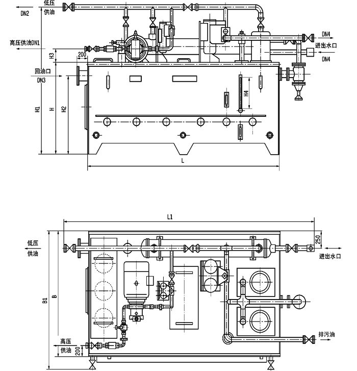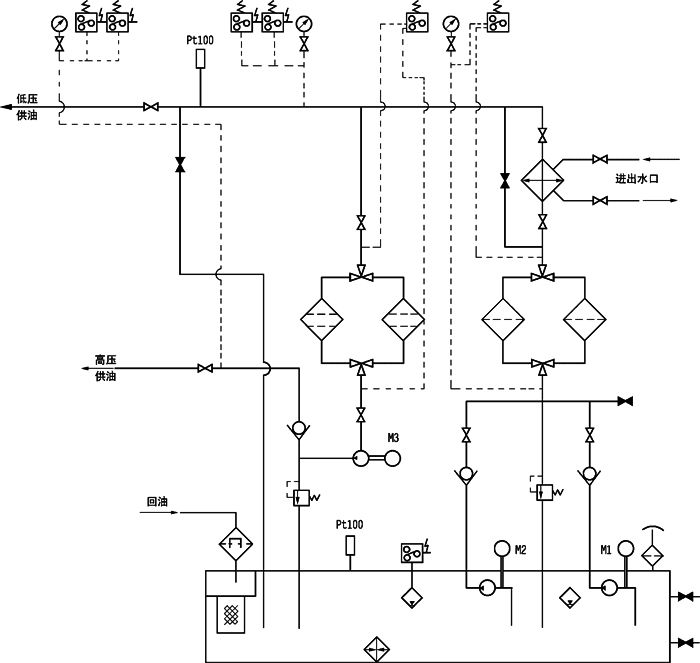 本油站為整體式,由油箱、兩臺低壓油泵、一臺高壓油泵、二臺雙筒網片式過濾器、回油磁網過濾裝置、列管式 油冷卻器、各種控制閥門、管道以及電接點壓力表、鉑熱電阻等組成。